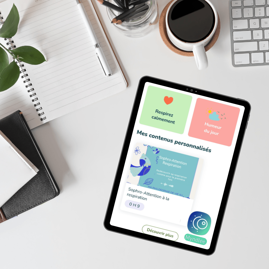 Vos pratiques sont disponible sur l’application MYNDLEE. Vous avez une un accès immédiat à vos 9 pratiques, que vous soyez au bureau, dans les transports ou chez vous.